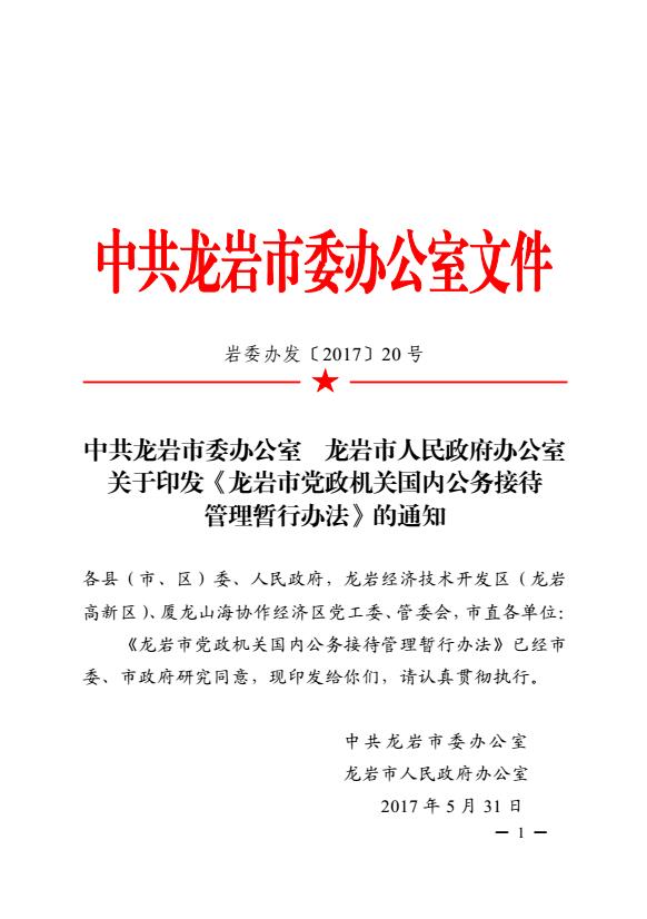 市委辦、市政府辦關(guān)于印發(fā)《龍巖市黨政機關(guān)國內(nèi)公務(wù)接待管理暫行辦法》的通知(巖委辦發(fā)【2017】20號)
