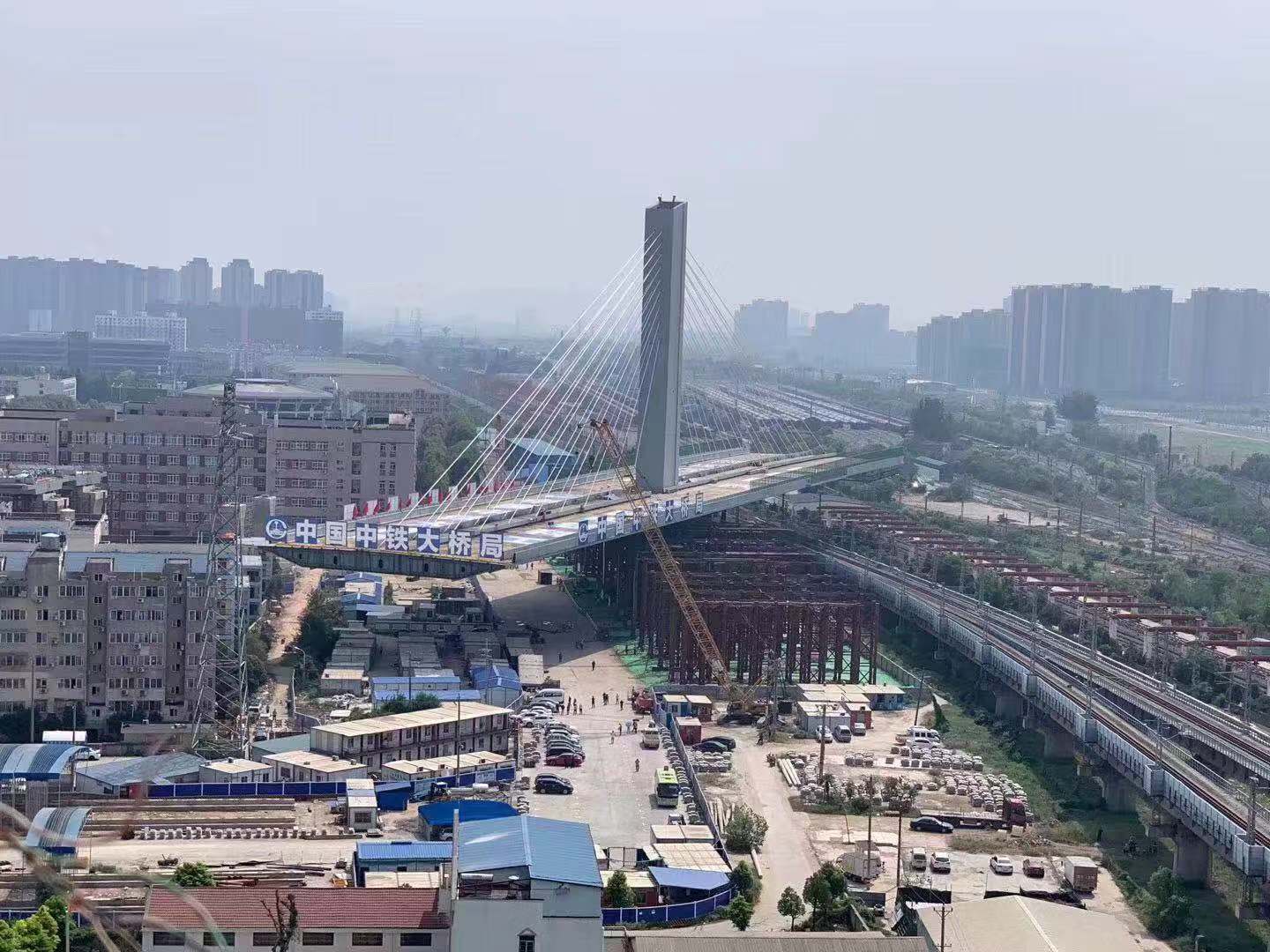 楊泗港快速通道青菱段是楊泗港長江大橋武昌接線,西起八坦立交,東至丁字橋路附近,全長4.46公里。因跨越繁忙的鐵路線,該項(xiàng)目采取鋼箱梁轉(zhuǎn)體施工法,即先在平行于鐵路的方向?qū)摿杭芎?,?span>“窗點(diǎn)實(shí)施高空轉(zhuǎn)體,使橋梁跨過鐵路,施工難度極大。